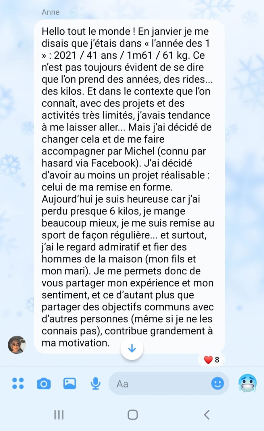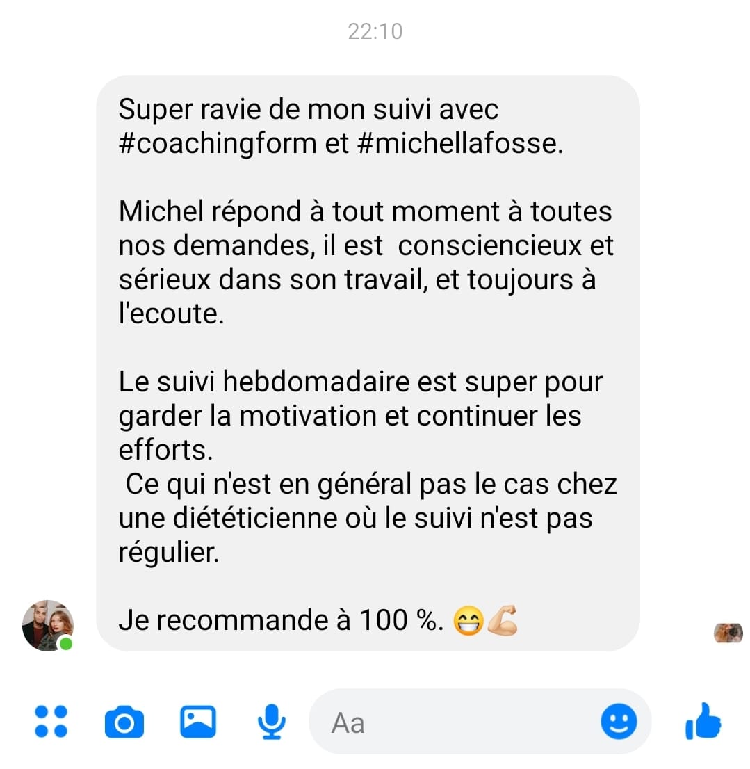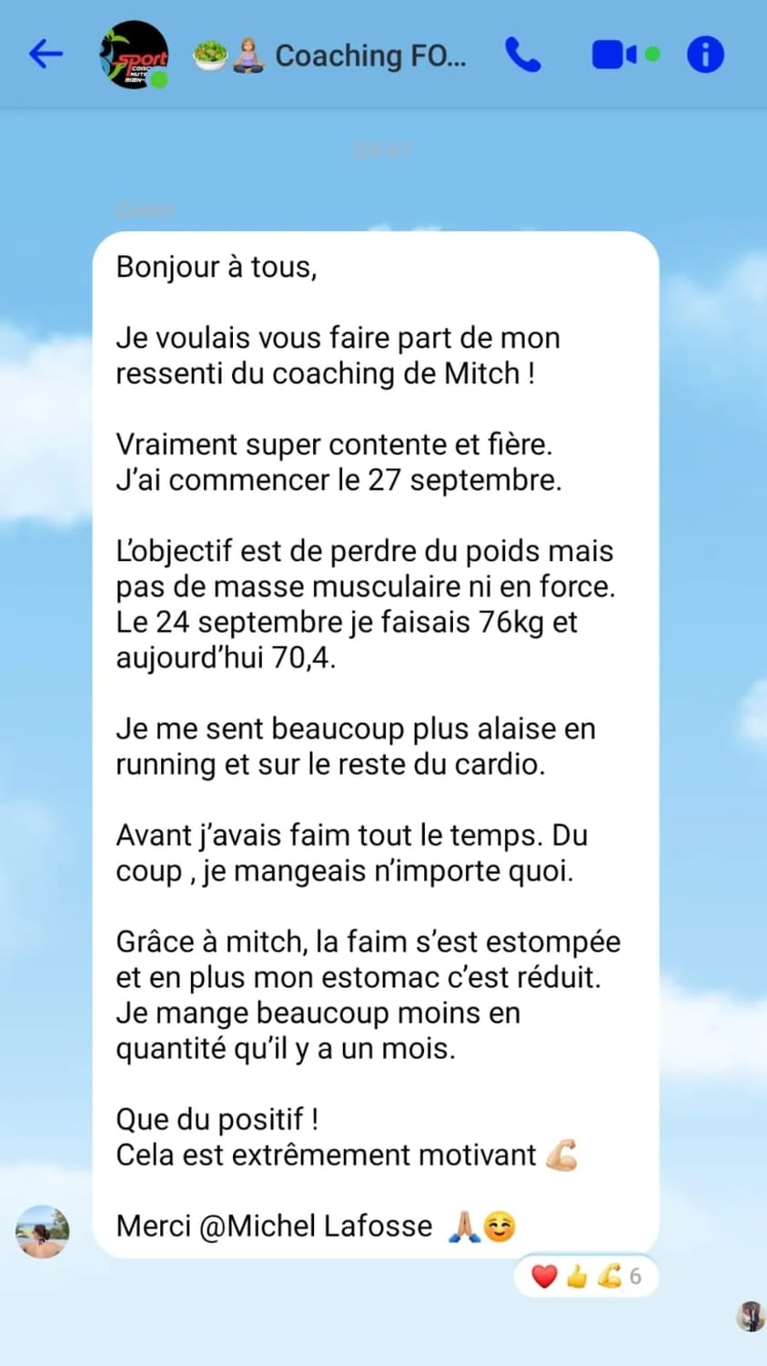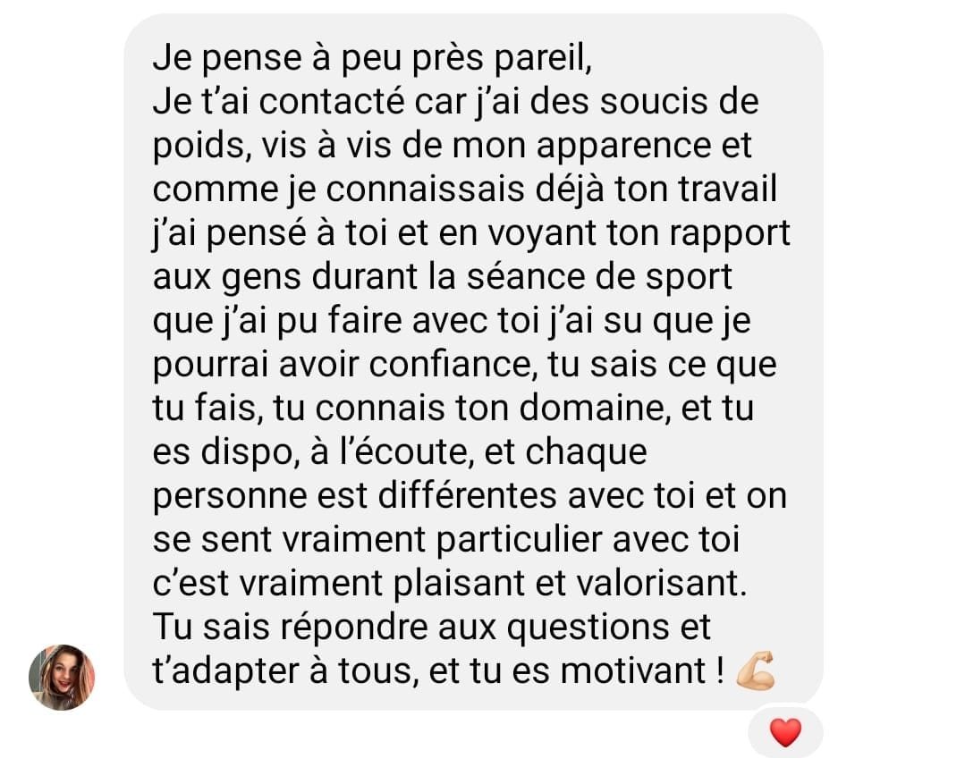 "Après 2 mois dans l''accompagnement, j'ai eu de très bons résultats avec plus de 8kg de perte, j'ai retrouvé la confiance en moi et mes proches le remarquent."